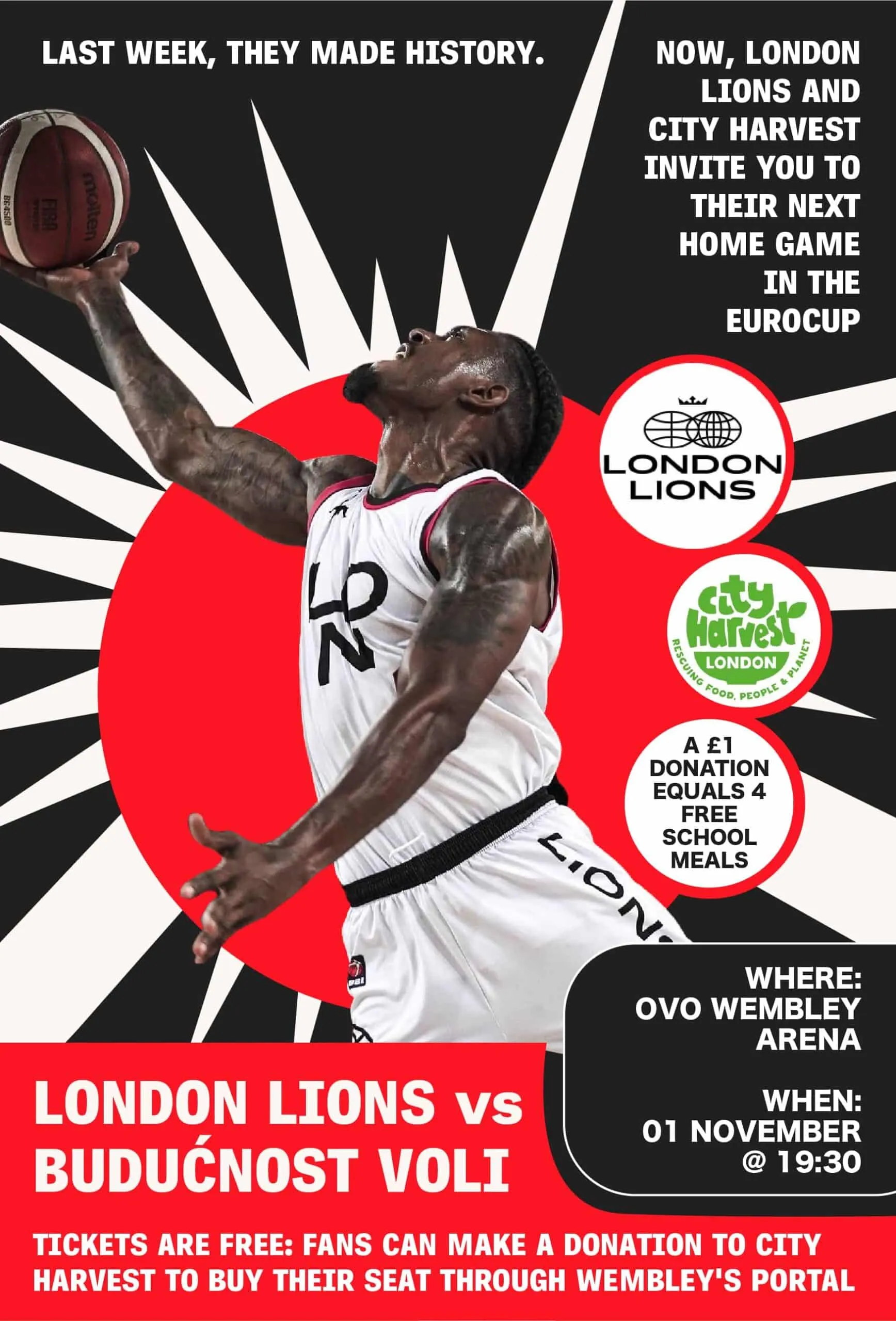On Tuesday 1st November, the London Lions will host their next home fixture in the EuroCup at the OVO Arena Wembley, with all attendance fees being waived in favour of donations for the London-based food distribution charity, City Harvest, with just a single donation of £1 providing up to four free meals for children supported by the organisation.