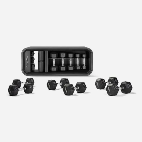Designed to challenge the largest muscle groups, this bundle expands the already complete set of equipment included in the Technogym Bench with 3 pairs of Hexagon Dumbbells of 12.5, 15, and 17.5 kg.