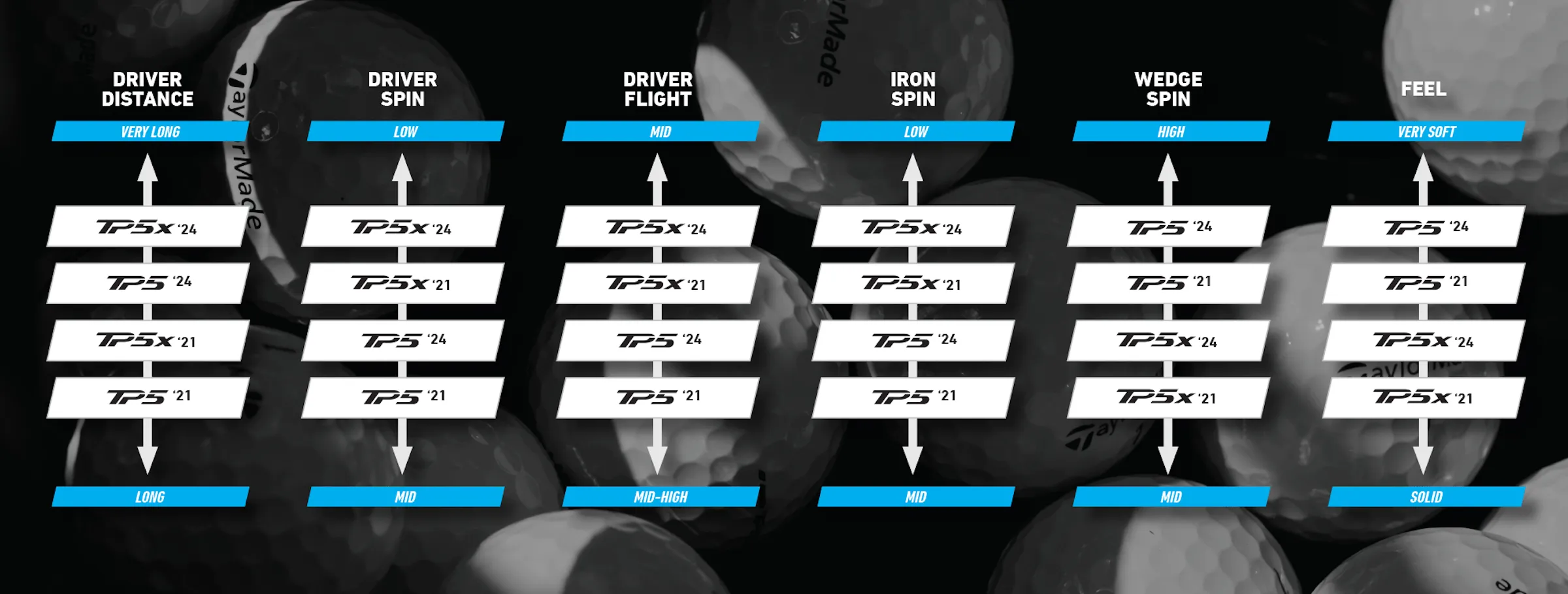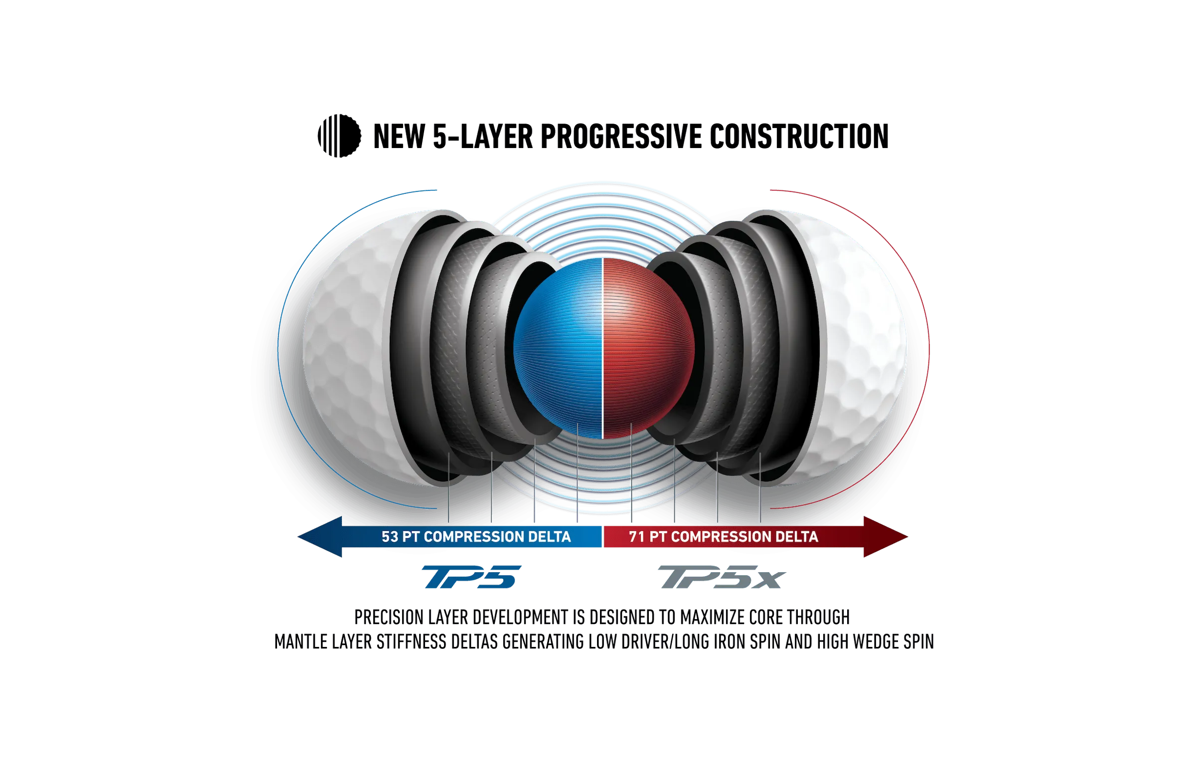 TP5 generates more spin on wedge shots, with TP5x producing less spin on drives and long iron shots in addition to a flatter trajectory.